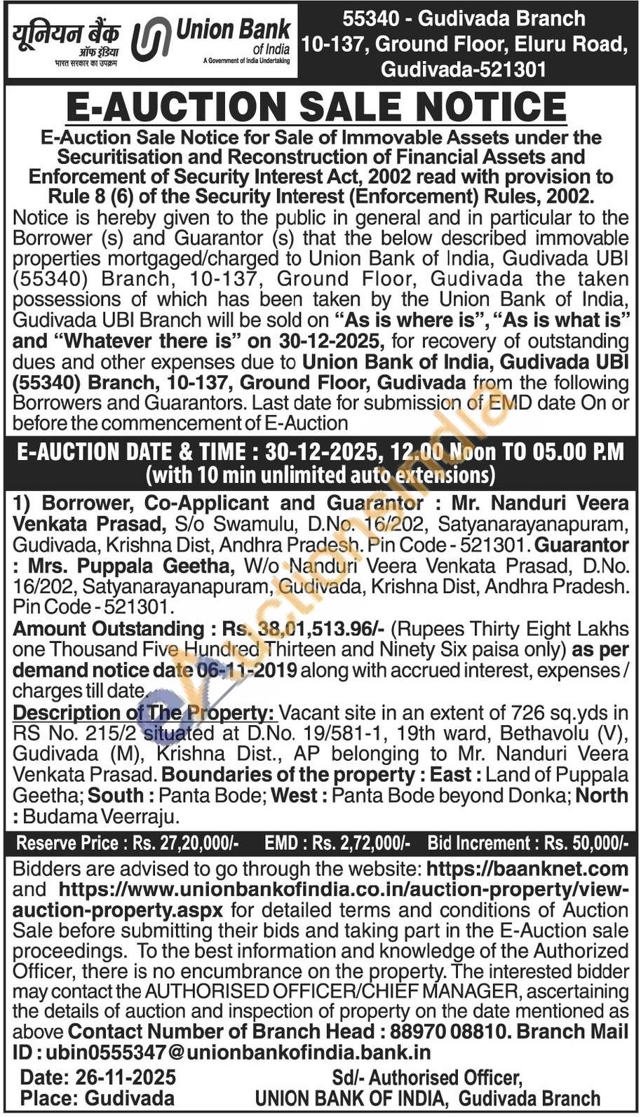 Vacant site in an extent of 726 sq.yds in RS No. 215/2 situated at D.No. 19/581-1, 19th ward, Bethavolu (V), Gudivada (M), Krishna Dist., AP belonging to Mr. Nanduri Veera Venkata Prasad. Boundaries of the property: East: Land of Puppala Geetha; South: Panta Bode; West: Panta Bode beyond Donka; North : Budama Veerraju.