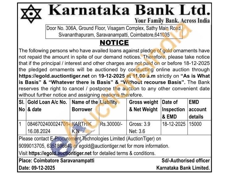 Karnataka Bank Gold Auctions Auction in Coimbatore