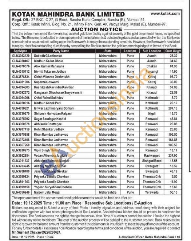 Kotak Mahindra Bank Gold Auctions Auction in Pune