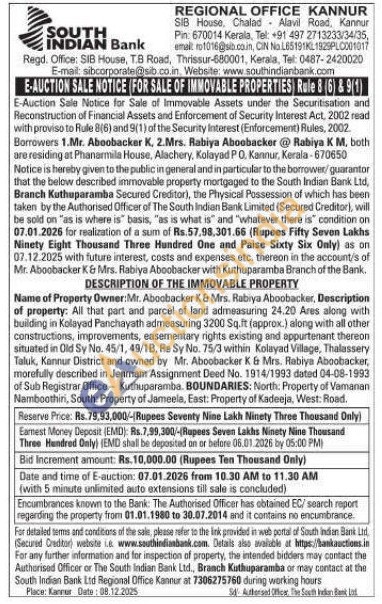 Name of Property Owner: Mr. Aboobacker K& Mrs. Rabiya Aboobacker, Description of property. All that part and parcel of land admeasuring 24.20 Ares along with building in Kolayad Panchayath admeasuring 3200 Sq.ft (approx.) along with all other constructions, improvements, easementary rights existing and appurtenant thereon situated in Old Sy No. 45/1, 49/1B, Re Sy No. 75/3 within Kolayad Village, Thalassery Taluk, Kannur District and owned by Mr. Aboobacker K. & Mrs. Rabiya Aboobacker, morefully described in Jenmam Assignment Deed No. 1914/1993 dated 04-08-1993 of Sub Registrar Office Kuthuparamba. BOUNDARIES: North: Property of Vamanan Namboothini, South: Property of Jameela, East: Property of Kadeeja, West: Road.