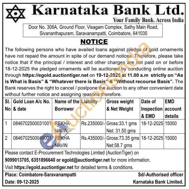 Karnataka Bank Gold Auctions Auction in Coimbatore