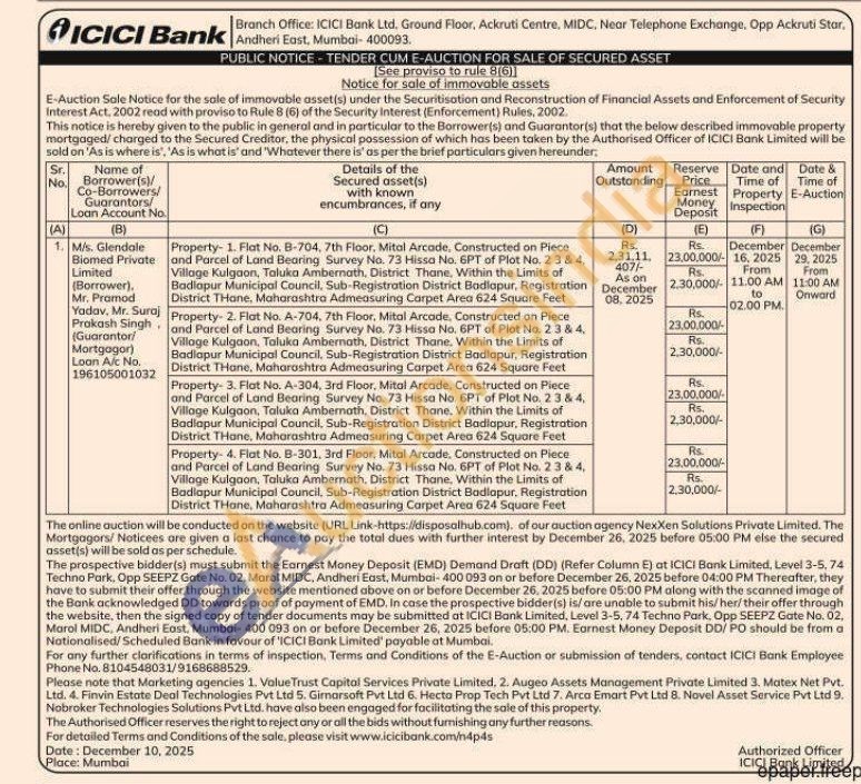 Property- 4. Flat No. B-301, 3rd Floor, Mital Arcade, Constructed on Piece and Parcel of Land Bearing Survey No. 73 Hissa No. 6PT of Plot No. 23 & 4, Village Kulgaon, Taluka Ambernath, District Thane, Within the Limits of Badlapur Municipal Council, Sub-Registration District Badlapur. Registration District Thane, Maharashtra Admeasuring Carpet Area 624 Square Feet