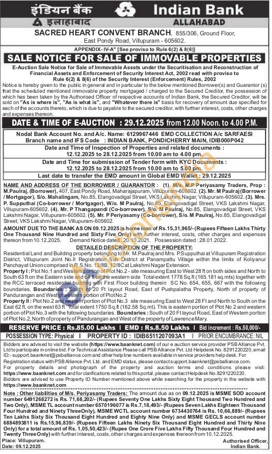 Residential Land and Building property belonging to Mr. M.Paulraj and Mrs. P.Supputhai at Villupuram Registration District, Villupuram Joint No.Il Registration Sub District at Panampattu Village within the limits of Koliyanur Panchayat Union comprised in R.S.No. 12/8B, 12/8C at Lakshmi Nagar Extension. Property 1: Plot No. 1 and Westem portion of Plot No.2-site measuring East to West 28 ft on both sides and North to South 63 ft on the Eastern side and 64 ft on the western side Total extent 1778 Sq.ft (165.181 sq.mts) together with the RCC terraced residential building with First Floor building therein SC No. 654, 655, 667 with the following boundaries. Boundaries: South of 20 Ft layout Road, East of Pushpalatha Property, North of property of Pandurangan and West of western portion of Plot No.2 Property II: Plot No.2 and westem portion of Plot No.3 site measuring East to West 28 Ft and North to South on the East 62 ft, on the west 63 ft Total extent 1750 Sq.ft (162.58 Sq.mt). This is eastern portion of Plot No 2 and western portion of Plot No.3 with the following boundaries. Boundaries: South of 20 Ft layout Road, East of Westem portion of Plot No.2, North of property of Pandurangan and West of the property of Lawrence Mary