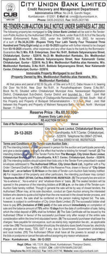 All that piece and parcel of 82.50 Sq.yds. of Site and a R.C.C. Daba House in it, bearing Old Door No.16-54, New Door No.16-81, in Purushothapatnam Grama D.No.56/1, Block No. 16, Situated within Chilakaluripet Municipal Area, Narasaraopet Registration District, Chilakalunpet Sub-District, Guntur District and bounded by East Joint Wall between this Property and Property of Chaillagundia Ramasubbarah-66 feet, South Wall of this Property and Property of Bodapati Sithamahalakshmi 11.3 feet, West Joint Wall between this Property and Property of Malineni Narayana Babu-65 feet, North Municipal Bazaar-11.3 feet