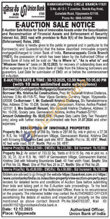 Property No.1: An extent of 356 Sq. Yards or 297.66 Sq. mts in plot no. s 37,38 in R.S. No 145/1 of Gannavaram Village, Gannavaram Mandal, Krishna Dist with following Boundaries East: park site; 66'0", South: Plot no. 36; 48'6", West: 40 feet wide road; 66'0", North: Plot no 39; 48'6