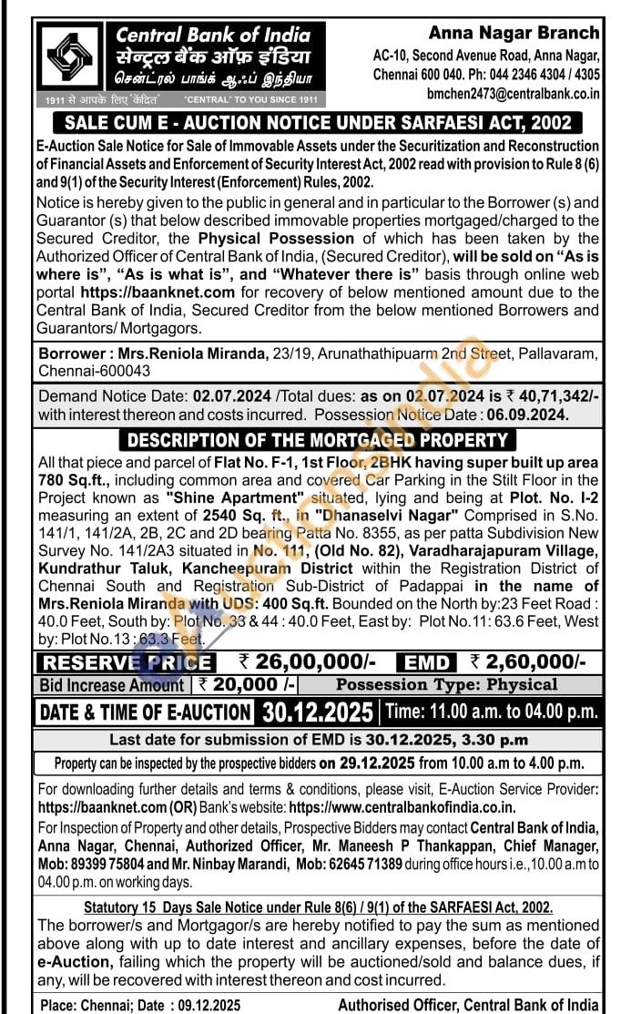 All that piece and parcel of Flat No. F-1, 1st Floor, 2BHK having super built up area 780 Sq.ft., including common area and covered Car Parking in the Stilt Floor in the Project known as "Shine Apartment" situated, lying and being at Plot. No. 1-2 measuring an extent of 2540 Sq. ft., in "Dhanaselvi Nagar" Comprised in S.No. 141/1, 141/2A, 2B, 2C and 2D bearing Patta No. 8355, as per patta Subdivision New Survey No. 141/2A3 situated in No. 111, (Old No. 82), Varadharajapuram Village, Kundrathur Taluk, Kancheepuram District within the Registration District of Chennai South and Registration Sub-District of Padappai in the name of Mrs.Reniola Miranda with UDS: 400 Sq.ft. Bounded on the North by:23 Feet Road: 40.0 Feet, South by: Plot No. 33 & 44: 40.0 Feet, East by: Plot No. 11: 63.6 Feet, West by: Plot No. 13:63.3 Feet.