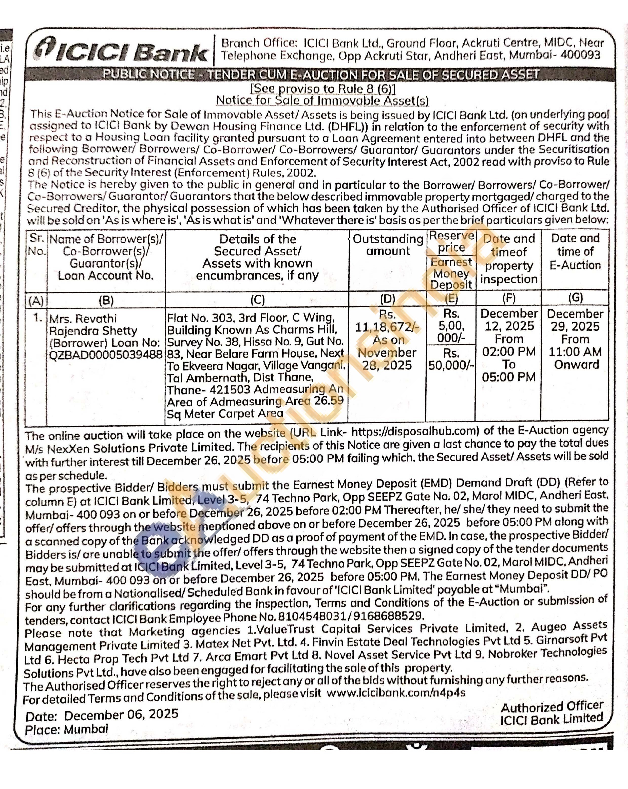 Flat No. 303, 3rd Floor, C Wing. Building Known As Charms Hill, Survey No. 38, Hissa No. 9, Gut No. 83, Near Belare Farm House, Next To Ekveera Nagar, Village Vangani, Tal Ambernath, Dist Thane, Thane-421503 Admeasuring An Area of Admeasuring Area 26.59 Sq Meter Carpet Area