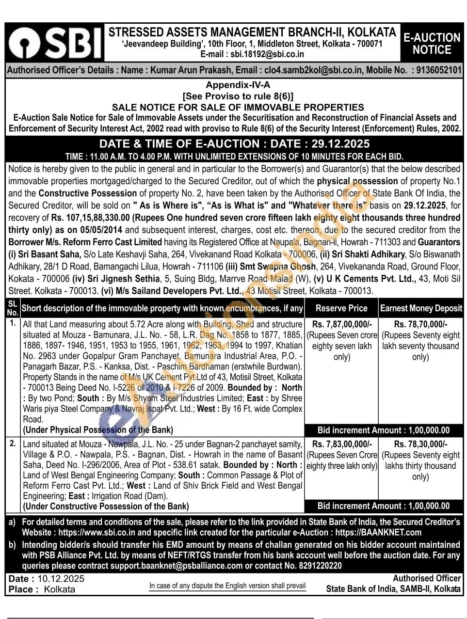 All that Land measuring about 5.72 Acre along with Building, Shed and structure situated at Mouza Bamunara, J.L. No. 58, L.R. Dag No. 1858 to 1877, 1885, 1886, 1897-1946, 1951, 1953 to 1955, 1961, 1962, 1963, 1994 to 1997, Khatian No. 2963 under Gopalpur Gram Panchayet, Bamunara Industrial Area, P.O. Panagarh Bazar, P.S. - Kanksa, Dist. - Paschim Bardhaman (erstwhile Burdwan). Property Stands in the name of M/s UK Cement Pvt.Ltd of 43, Motisil Street, Kolkata -700013 Being Deed No. 1-5226 of 2010 & 1-7226 of 2009. Bounded by: North : By two Pond; South: By M/s Shyam Steel Industries Limited; East: by Shree Waris piya Steel Company & Navraj Ispat Pvt. Ltd.; West: By 16 Ft. wide Complex Road. (Under Physical Possession of the Bank