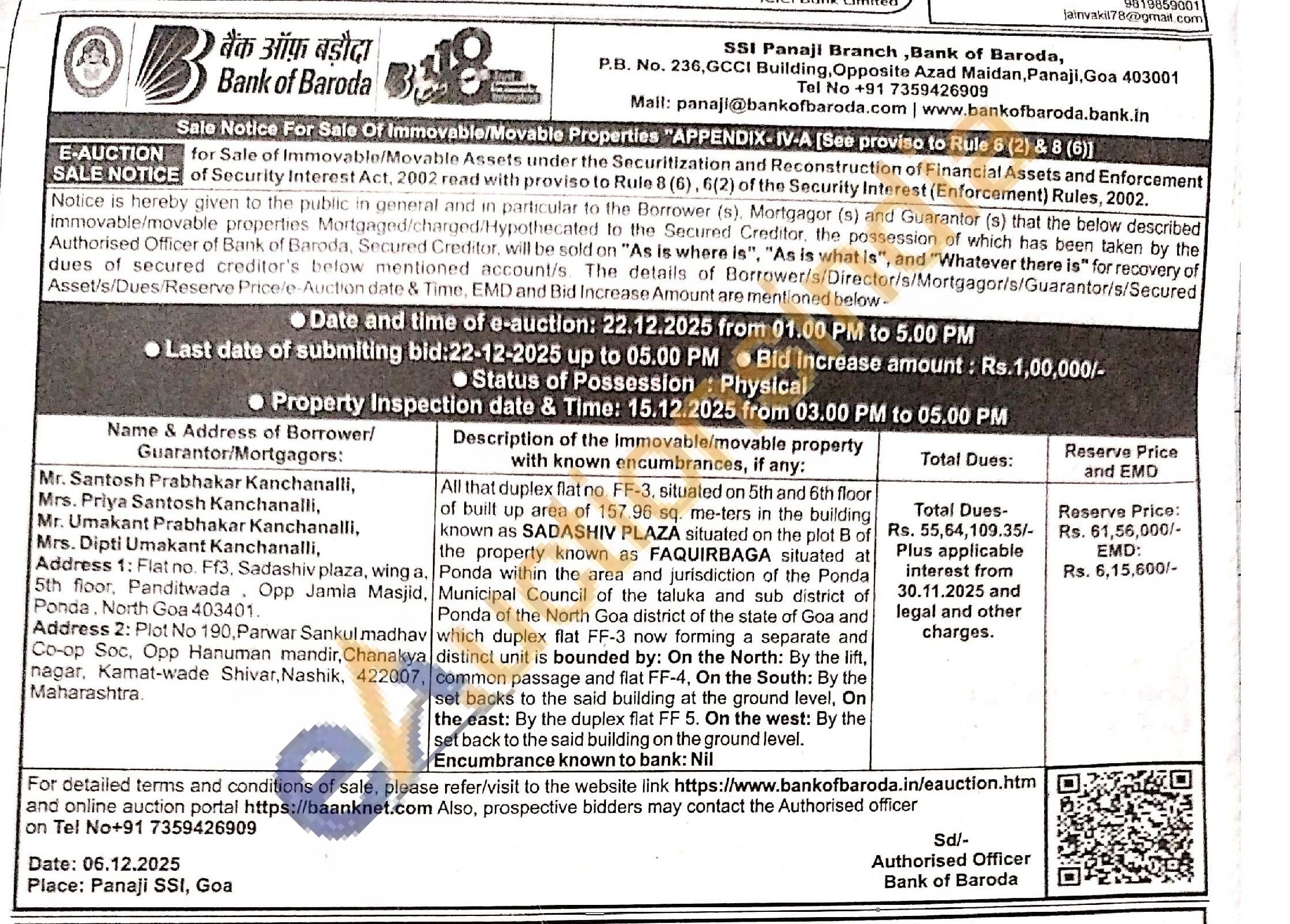 All that duplex flat no. FF-3, situated on 5th and 6th floor of built up area of 157.96 sq. me-ters in the building known as SADASHIV PLAZA situated on the plot B of the property known as FAQUIRBAGA situated at Ponda within the area and jurisdiction of the Ponda Municipal Council of the taluka and sub district of Ponda of the North Goa district of the state of Goa and which duplex flat FF-3 now forming a separate and distinct unit is bounded by: On the North: By the lift, common passage and flat FF-4, On the South: By the set backs to the said building at the ground level, On the east: By the duplex flat FF 5. On the west: By the set back to the said building on the ground level. Encumbrance known to bank: Nil