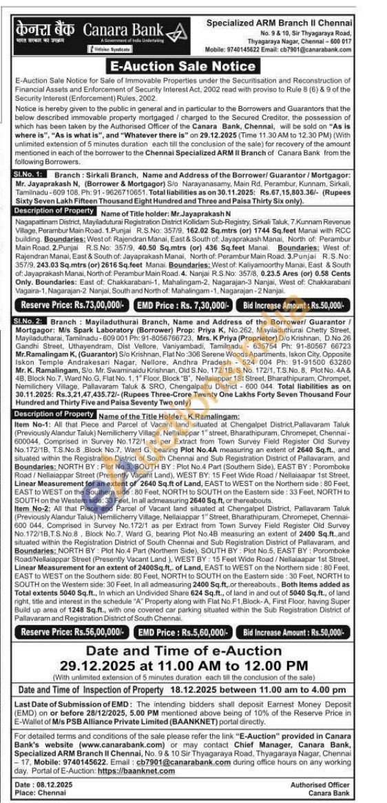 Item No-1: All that Piece and Parcel of Vacant land situated at Chengalpet District Pallavaram Taluk (Previously Alandur Taluk) Nemilcherry Village, Nellaiappar 1" street, Bharathipuram. Chromepet, Chennai-600044, Comprised in Survey No. 172/1 as per Extract from Town Survey Field Register Old Survey No.172/18. T.S.No. 8 Block No.7. Ward G. bearing Plot No.4A measuring an extent of 2640 Sq.ft., and situated within the Registration District of South Chennai and Sub Registration District of Pallavaram, and Boundaries: NORTH BY: Plot No.3, SOUTH BY: Plot No.4 Part (Southerm Side), EAST BY: Poromboke Road/Nellaiappar Street (Presently Vacant Land), WEST BY: 15 Feet Wide Road/Nellaiaapar 1st Street. Linear Measurement for an extent of 2640 Sq.ft of Land, EAST to WEST on the Northem side: 80 Feet. EAST to WEST on the Southern side: 80 Feet, NORTH to SOUTH on the Eastem side: 33 Feet, NORTH to SOUTH on the Western side: 33 Feet, In all admeasuring 2640 Sq. ft, or thereabouts. Item No-2: All that Piece and Parcel of Vacant land situated at Chengalpet District, Pallavaran Taluk (Previously Alandur Taluk) Nemlicherry Village, Nellaiappar 1 Street, Bharathipuram, Chromepet, Chennai 600 044. Comprised in Survey No. 172/1 as per Extract from Town Survey Field Register Old Survey No. 172/18.TS.No.8, Block No.7, Ward G, bearing Plot No.48 measuring an extent of 2400 Sq.ft. and situated within the Registration District of South Chennai and Sub Registration District of Pallavaram, and Boundaries: NORTH BY Plot No.4 Part (Northern Side), SOUTH BY: Plot No.5, EAST BY: Poromboke Road/Nellatappar Street (Presently Vacant Land), WEST BY 15 Feet Wide Road/Nellaiaapar 1st Street. Linear Measurement for an extent of 24605q.ft. of Land, EAST to WEST on the Northem side: 80 Feet, EAST to WEST on the Southern side: B0 Feet, NORTH to SOUTH on the Eastern side: 30 Feet, NORTH to SOUTH on the Western side: 30 Feet, In all admeasuring 2400 Sq.ft or thereabouts. Both items added as Total extents 5040 Sq.ft., In which an Undivided Share 624 Sq.ft., of land in and out of 5040 Sq.ft., of land right, title and interest in the schedule "A" Property along with Flat No F1, Block-A, First Floor, having Super Build up area of 1248 Sq.ft., with one covered car parking situated within the Sub Registration District of Pallavaram and Registration District of South Chennai.