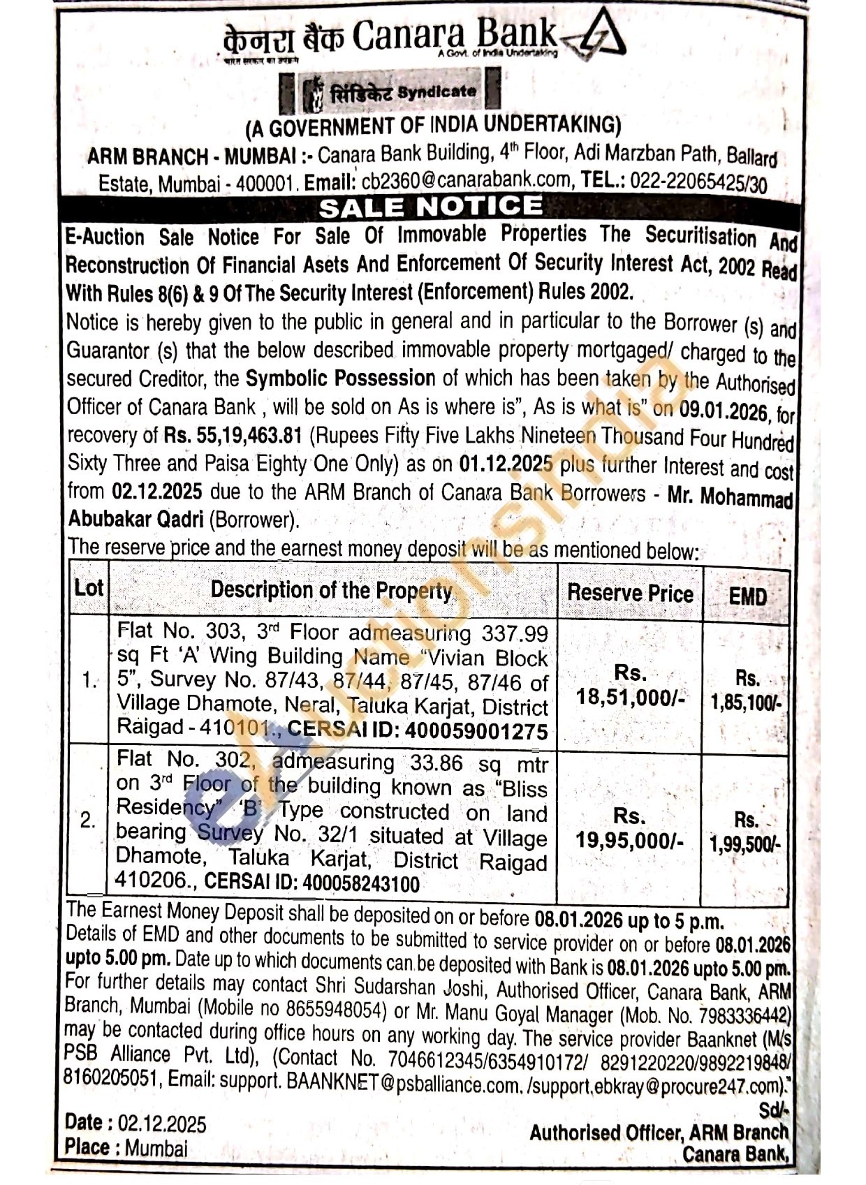Flat No. 303, 3rd Floor admeasuring 337.99 sq Ft 'A' Wing Building Name "Vivian Block 5", Survey No. 87/43, 87/44, 87/45, 87/46 of Village Dhamote, Neral, Taluka Karjat, District Raigad -410101., CERSAI ID: 400059001275