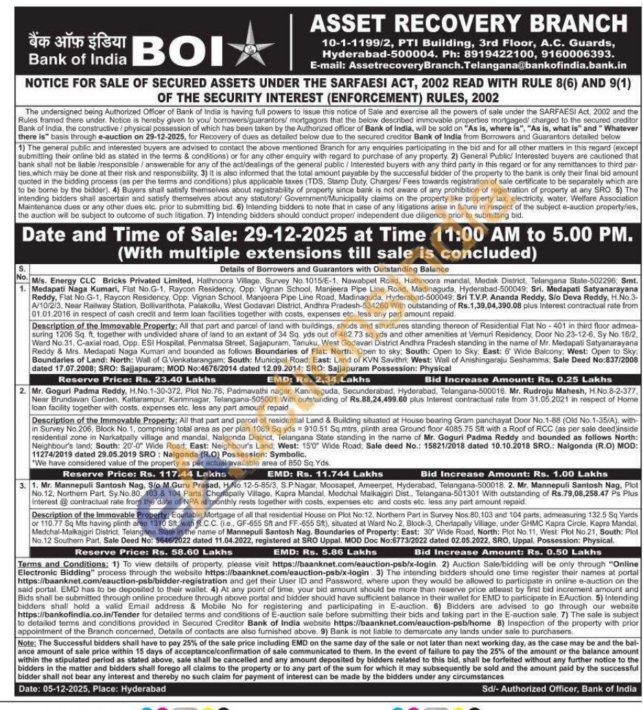 Description of the Immovable Property: All that part and parcel of land with buildings, sheds and structures standing thereon of Residential Flat No-401 in third floor admea-suring 1206 Sq ft, together with undivided share of land to an extant of 34 Sq. yds out of 482.73 sq.yds and other amenities at Vemuri Residency, Door No. 23-12-6, Sy No. 16/2, Ward No. 31, C-axial road, Opp. ESI Hospital, Penmatsa Street, Sajjapuram, Tanuku, West Godavari District Andhra Pradesh standing in the name of Mr. Medapati Satyanarayana Reddy & Mrs. Medapati Naga Kumari and bounded as follows Boundaries of Flat: North: Open to sky: South: Open to Sky. East: 6' Wide Balcony: West: Open to Sky: Boundaries of Land: North: Wall of G. Venkatarangam: South: Municipal Road: East: Land of KVN Savithri: West: Wall of Anishingaraju Seshamma; Sale Deed No:837/2008 dated 17.07.2008; SRO: Sajjapuram: MOD No:4676/2014 dated 12.09.2014; SRO: Sajjapuram Possession: Physical