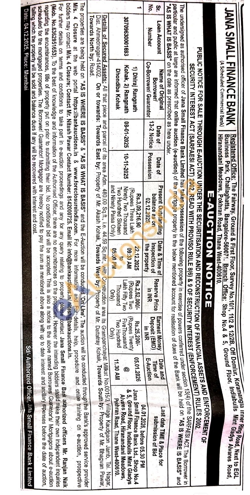 Details of Secured Assets: All that piece and parcel of its area Adm. 480.00 Sq.ft., i.e. 44.59 Sq.mtr., with Construction area its Grampanchayat Milkat No.0015/3, Village Kaudgaon Jamb, Tai. Nagar, Dist. Ahmednagar-414002. On or towards: Towards East by: Property of Mr. Akash Kohak, Towards West by: Property of Mr. Dattatray Kohak, Towards South by: Property of Mr. Bhagvan Pawar, Towards North by: Road