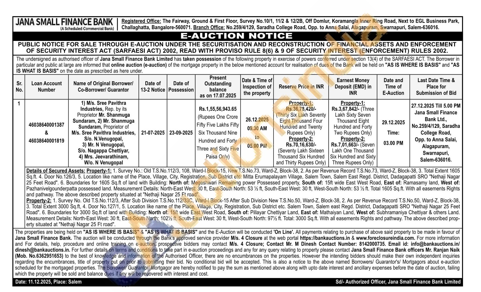 Property-2: 1. Survey No. Old T.S.No. 112/3, After Sub Division T.S.No. 112/33C, Ward-1 Block-15 After Sub Division New T.S.No.50, Ward-Z, Block-38, 2. As per Revenue Record T.S.No.50, Ward-Z, Block-38, 3. Total Extent 3000 Sq.ft, 4. Door No. 127/1, 5. Location like name of the Place, Village, City, Registration, Sub District etc. Salem Town, Salem east Regd. District, Dadagapatti SRO "Nethaji Nagar 25 Feet Road". 6. Boundaries for 3000 Sq.ft of land with Building: North of: 15ft wide East West Road, South of: Pillayar Chettiyar Land, East of: Mathaiyan Land, West of: Subhramaniya Chettiyar & others Land. Measurement Details: North-East West: 30 ft, East-South North: 102% ft, South-East West: 30 ft, West-South North: 97% ft. Total: 3000 Sq.ft. With all easements Rights and pathway. The above described prop-erty situated at "Nethaji Nagar 25 Ft road".
