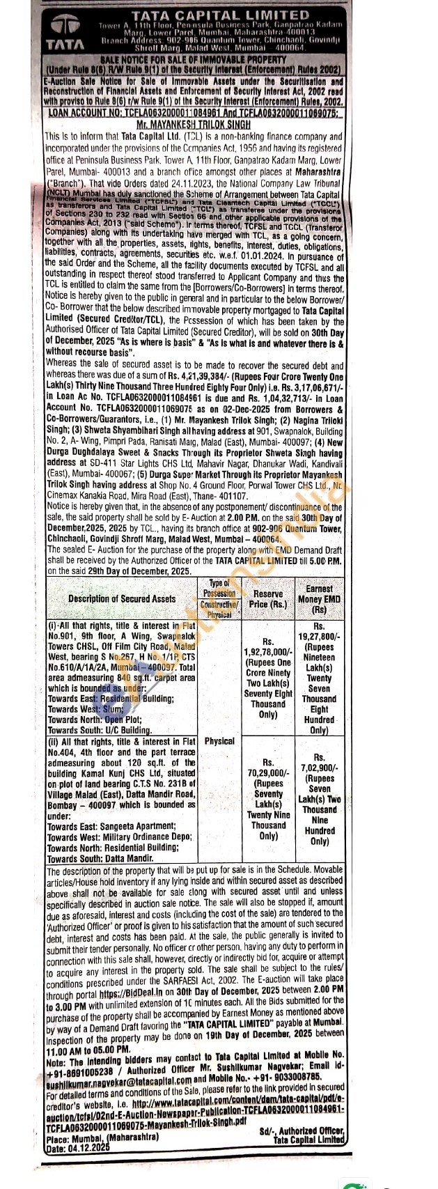 -All that rights, title & interest in Flat No.901, 9th floor, A Wing, Swapnalok Towers CHSL, Off Film City Road, Malad West, bearing S No.267, H No. 1/1P, CTS No.610/A/1A/2A, Mumbai-400097. Total area admeasuring 840 sq.ft. carpet area which is bounded as under: Towards East: Residential Building; Towards West: Slum; Towards North: Open Plot; Towards South: U/C Building.