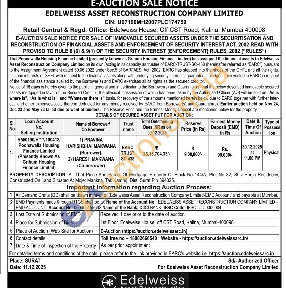 PROPERTY DESCRIPTION: All That Piece And Parcel Of Mortgage Property Of Block No 144/A, Plot No 82, Shiv Pooja Residnecy, Constructed On Land Situated At Moje: Mankna, Tal: Kamrej, Dist: Surat Pin 394325.