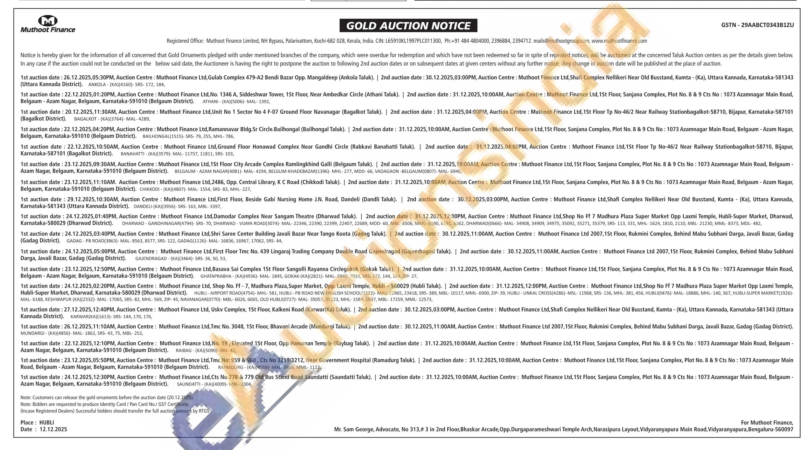 Muthoot Finance Ltd Gold Auctions Auction in Hubballi