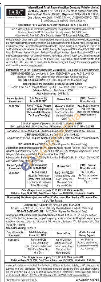 Description of the Immovable property/ Secured Asset: Flat No. 01. on the ground floor, B wing, in the building known as bhagirathi regency, society known as Bhagirathi regency co-operative housing sociely itd. situated at VIII. Kulgaon, Badlapur (W), Tai Ambernath, Dist. Thane, MH, 421503 Area Ad measuring 602 sq. ft.