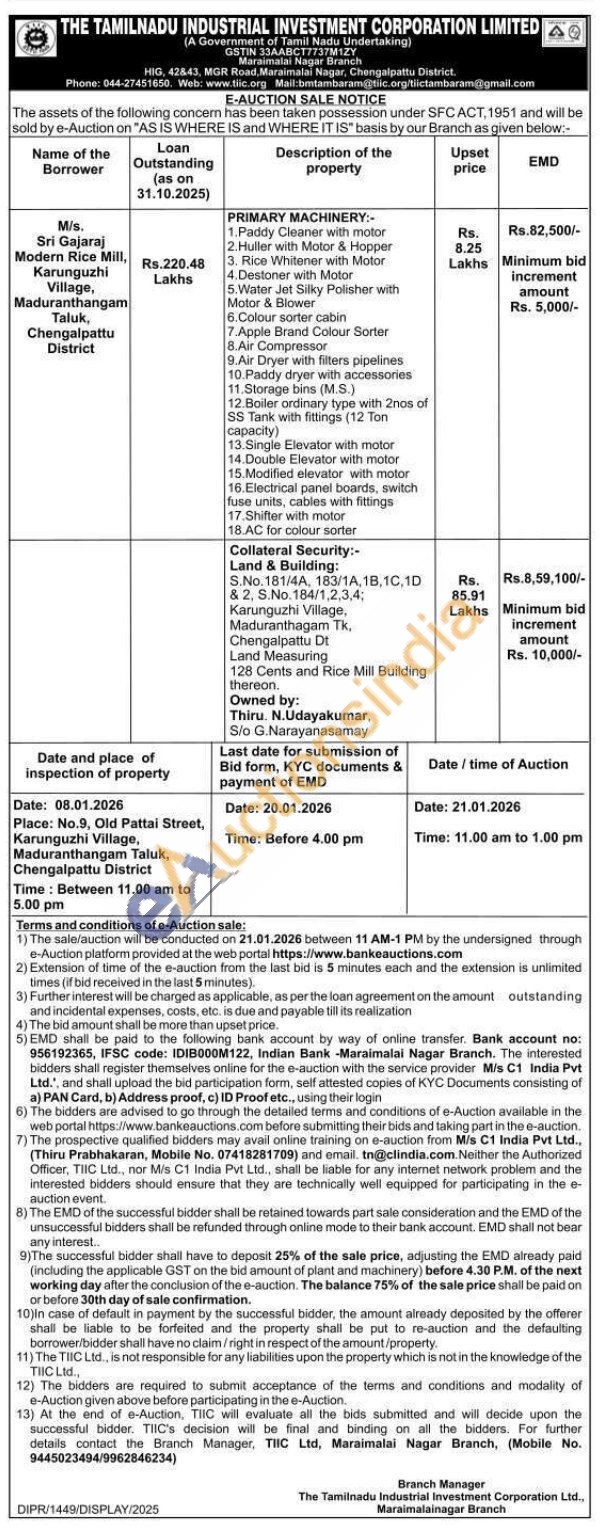 S.No. 181/4A, 183/1A, 18,10,10 Land & Building: &2. S.No. 184/1,2,3,4 Karunguzhi Village, Maduranthagam Tk, Chengalpattu Di Land Measuring 128 Cents and Rice Mill Building thereon