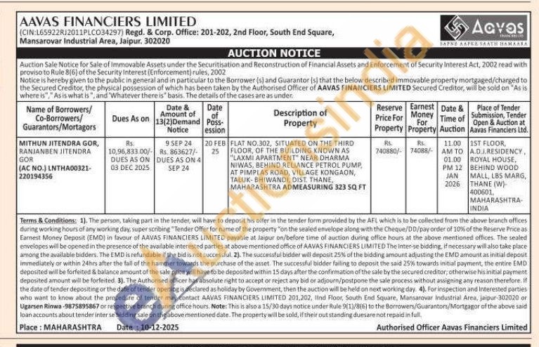 FLAT NO.302, SITUATED ON THE THIRD FLOOR, OF THE BUILDING KNOWN AS "LAXMI APARTMENT NEAR DHARMA NIWAS, BEHIND RELIANCE PETROL PUMP AT PIMPLAS ROAD, VILLAGE KONGAON, TALUK-BHIWANDI, DIST, THANE, MAHARASHTRA ADMEASURING 323 SQ FT