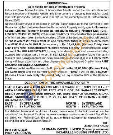 FLAT NO. 405, AREA ADMEASURING ABOUT 994 SQ. FEET, SUPER BUILT-UP AREA ADMEASURING 1590 SQ. FEET, 4TH FLOOR, SAI SAHAJ RESIDENCY, BESIDE AKSHAR DARSHAN DUPLEX, NR. BAPS TEMPLE ATLADRA, PADRA ROAD, VADODARA, T. P. 20, F. P. 21, 22, RS. 354 1, VADODARA 390012,