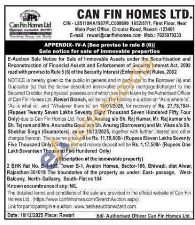 2 BHK flat No. B-1-103, Tower B-1, Avalon Homes, Sector-106, Bhiwadi, dist Alwar, Rajasthan-301019 The boundaries of the property as under: East- passage, West-Balcony, North-Gallaery, South-Flat no 104