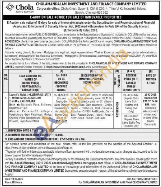 All that piece and parcel of residential house Total measuring area 189.11 Sq yards, Situated at patta no. 37, Village-Narsinghpura, Gram panchayat-Girdiya Tehsil Shahpura. Dist -Bhilwara. Rajasthan-311404 And Bounded Or East-Rajaram Gurjar, West-Road. North Road South-Self Bacia