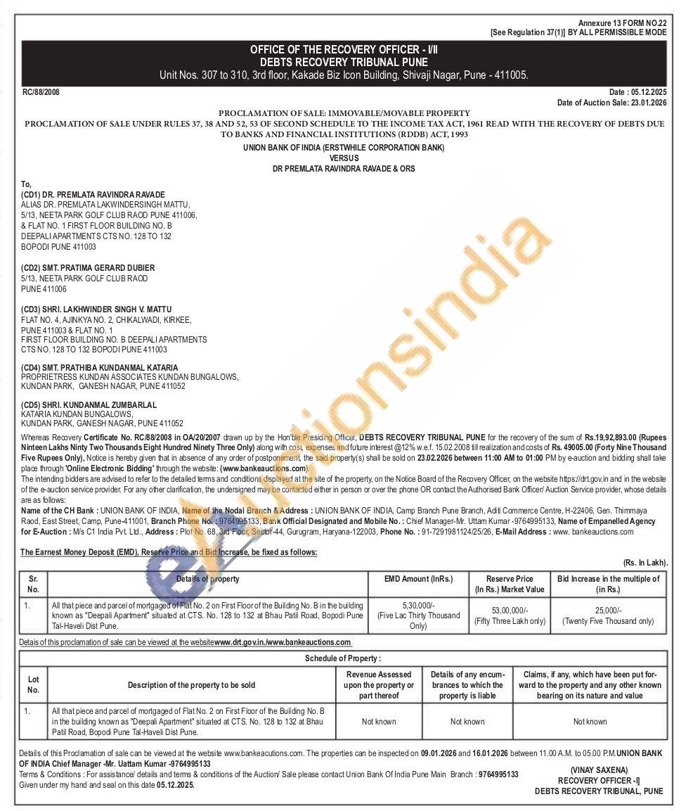 All that piece and parcel of mortgaged of Fiat No. 2 on First Floor of the Building No. B in the building known as "Deepali Apartment situated at CTS. No 128 to 132 at Bhau Patil Road, Bopodi Pune Tal-Haveli Dist Pune