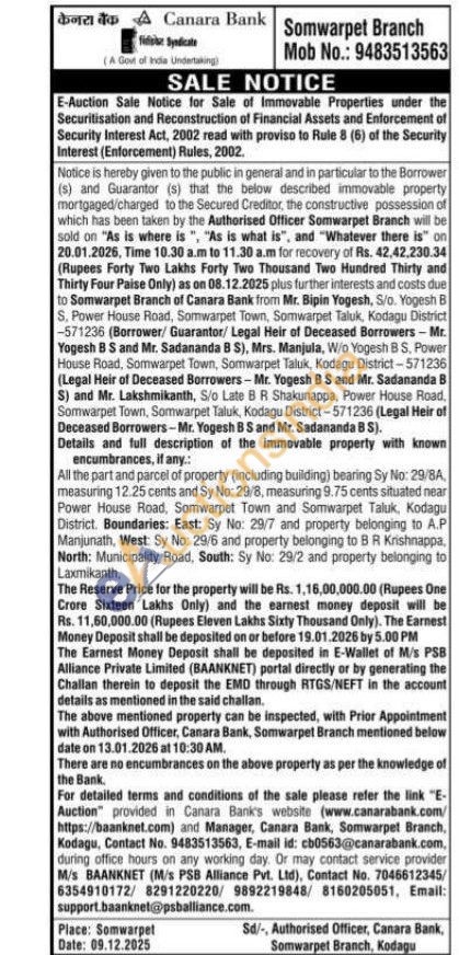 All the part and parcel of property (including building) bearing Sy No: 29/8A, measuring 12.25 cents and Sy No: 29/8, measuring 9.75 cents situated near Power House Road, Somwarpet Town and Somwarpet Taluk, Kodagu District. Boundaries: East: Sy No: 29/7 and property belonging to A.P Manjunath, West: Sy No: 29/6 and property belonging to B R Krishnappa, North: Municipality Road, South: Sy No: 29/2 and property belonging to Laxmikanth