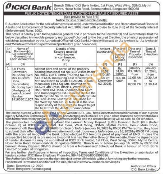 1)All that part and parcel of the property bearing municipal old No. 119, Assessment No. 2067/119, E katha (PID No.) No. 21-1-513-61A2N measuring East to West 9.14 Mtr. and North to South 15.24 Mtr. in total measuring 139.4 Sq. Mtr. situated at No. 61A2N, 4th Cross, Block 1. Ward No. 21, RMC Yard, BM Road, Channapatna Town and Ramanagara Dist. Bounded By: On the North by: Site No. 118 On the South by: Site No. 120 On the East by: APMC Road On the West by: Site No. 70 Note: It is the sole responsibility of the successful buyer to get the NOC from the APMC, Channapatna.