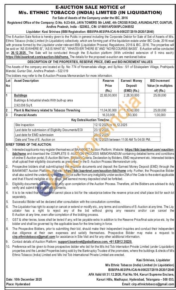 The Assets of the company are located at Sy. No: 774 of Yenamadala village, and Sy.Nos: 5/1 of Edulapalem Village, Prathipadu Mandal, Guntur Dist., Andhra Pradesh - 522 019 Buildings & Industrial sheds With built-up area 2,92,038 Sq ft.