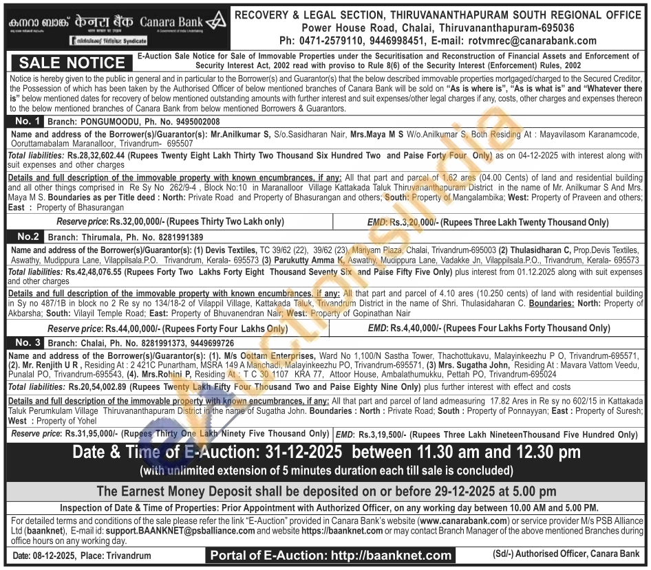 Details and full description of the immovable property with known encumbrances, if any: All that part and parcel of land admeasuring 17.82 Ares in Re sy no 602/15 in Kattakada Taluk Perumkulam Village Thiruvananthapuram District in the name of Sugatha John. Boundaries: North: Private Road; South: Property of Ponnayyan; East: Property of Suresh; West: Property of Yohel