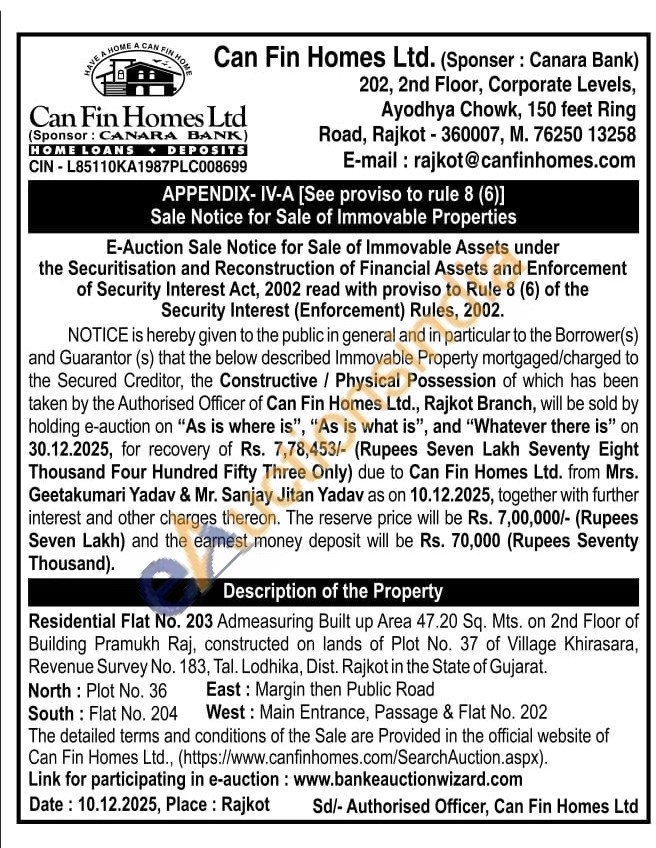 Residential Flat No. 203 Admeasuring Built up Area 47.20 Sq. Mts. on 2nd Floor of Building Pramukh Raj, constructed on lands of Plot No. 37 of Village Khirasara, Revenue Survey No. 183, Tal. Lodhika, Dist. Rajkot in the State of Gujarat. North: Plot No. 36 East: Margin then Public Road South: Flat No. 204 West: Main Entrance, Passage & Flat No. 202