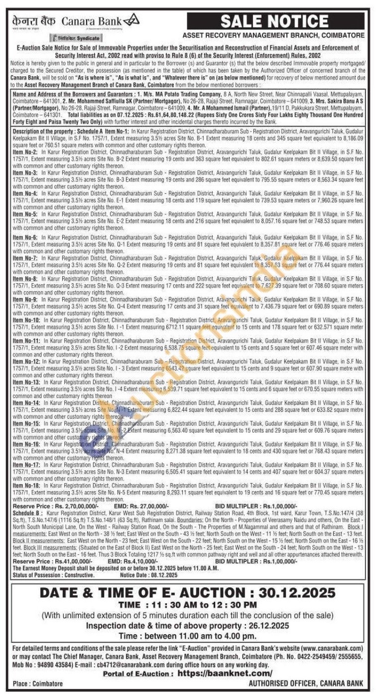 Description of the property: Schedule A Item No-1: In Karur Registration District, Chinnadharaburam Sub-Registration District, Aravangurichi Taluk, Gudalur Keelpakam Bit II Village, in S.F No. 1757/1, Extent measuring 3.5% acres Site No. B-1 Extent measuring 18 cents and 345 square feet equivalent to 8,186.09 square feet or 760.51 square meters with common and other customary rights thereon. Item No-2: In Karur Registration District. Chinnadharaburam Sub-Registration District, Aravangurichi Taluk, Gudalur Keelpakam Bit II Village, in S.F No. 1757/1, Extent measuring 3.5% acres Site No. B-2 Extent measuring 19 cents and 363 square feet equivalent to 802.61 square meters or 8.639.50 square feet with common and other customary rights thereon. Item No-3: In Karur Registration District, Chinnadharaburam Sub-Registration District, Aravangurichi Taluk, Gudalur Keelpakam Bit Il Village, in SF No. 1757/1, Extent measuring 3.5% acres Site No. 8-3 Extent measuring 19 cents and 286 square feet equivalent to 795.55 square meters or 8.563.34 square feet with common and other customary rights thereon. Item No-4: In Karur Registration District, Chinnadharaburam Sub-Registration District, Aravangurichi Taluk, Gudalur Keelpakam Bit II Village, in S.F No. 1757/1, Extent measuring 3.5% acres Site No. E-1 Extent measuring 18 cents and 119 square feet equivalent to 739.53 square meters or 7,960.26 square feet with common and other customary rights thereon. Item No-5: In Karur Registration District, Chinnadharaburam Sub-Registration District, Aravangurichi Taluk, Gudalur Keelpakam Bit II Vilage, in S.F No. 1757/1, Extent measuring 3.5% acres Site No. E-2 Extant measuring 18 cents and 216 square feet equivalent to 8.057.16 square feet or 748.53 square meters with common and other customary rights thereon Item No-6: In Karur Registration District, Chinnadharaburam Sub-Registration District, Aravangurichi Talok, Gudalur Keelpakam Bit Il Village, in S.F. No 1757/1, Extent measuring 3.5% acres Site No. 0-1 Extent measuring 19 cents and 81 square feet equivalent to 8.357.81 square feet or 776.46 square meters with common and other customary rights thereon. Item No-7: In Karur Registration District, Chinnadharaburam Sub-Registration District, Aravangurichi Taluk, Gudalur Keelpakam Bit Il Village, in S.F No. 1757/1, Extent measuring 3.51% acres Site No. 0-2 Extent measuring 19 cents and 81 square feet equivalent to 8.357.63 square feet or 776.44 square meters with common and other customary rights thereon Item No-l: In Karur Registration District, Chinnadharaburam Sub-Registration District, Aravangurichi Taluk, Gudalur Keelpakam Bit II Village, in SF No. 1757/1, Extent measuring 3.5% acres Site No. 0-3 Extent measuring 17 cents and 222 square feet equivalent to 7,627.39 square feet or 708 60 square meters with common and other customary rights thereon. Item No-9: In Karur Registration District, Chinnadharaburam Sub Registration District, Aravangurichi Taluk, Gudalur Keelpakam Bit II Village, in S.F No. 1757/1. Extent measuring 3.5% acres Site No. 0-4 Extent measuring 17 cents and 31 square feet equivalent to 7.436.79 square feet or 690.89 square meters with common and other customary rights thereon. Item No-10: In Karur Registration District, Chinnadharaburam Sub-Registration District, Aravangurichi Taluk, Gudalur Keelpakam Bit II Village, in SF No. 1757/1, Extent measuring 3.5% acres Site No. 1-1 Extent measuring 6712.11 square feet equivalent to 15 cents and 178 square feet or 632.571 square meter with common and other customary rights thereon. Item No-11: In Karur Registration District, Chinnadharaburam Sub-Registration District, Aravangurichi Taluk, Gudalur Keelpakam Bit II Village, in S.F No. 1757/1, Extent measuring 3.5% acres Site No. 1-2 Extent measuring 6.538.75 square feet equivalent to 15 cents and 5 square feet or 607.46 square meter with common and other customary rights thereon. Item No-12: in Karur Registration District, Chinnadharaburam Sub-Registration District, Aravangurichi Taluk, Gudalur Keelpakarn Bit II Village, in S.F No. 1757/1, Extent measuring 3.5% acres Site No. 1-3 Extent measuring 6543.42 square feet equivalent to 15 cents and 9 square feet or 607.90 square metre with common and other customary rights thereon. Item No-13: In Karur Registration District, Chinnadharaburam Sub Registration District, Aravangurichi Taluk, Gudalur Keelpakam Bit II Village, in S.F No. 1757/1, Extent measuring 3.5% acres Site No. 1-4 Extent measuring 6,539.71 square feet equivalent to 15 cents and 6 square feet or 670.55 square meters with common and other customary rights thereon Item No-14; In Karur Registration District, Chinnadharaburam Sub-Registration District, Aravangurichi Taluk, Gudalur Keelpakam Bit II Village, in S.F No. 1757/1, Extent measuring 3.5% acres Site No. N-1 Extent measuring 6,822.44 square feet equivalent to 15 cents and 285 square feet or 633.82 square metre with common and other customary rights thereon. Item No-15: In Karur Registration District, Chinnadharaburam Sub Registration District. Aravangurichi Taluk, Gudalur Keelpakam Bit II Village, in S.F No. 1757/1, Extent measuring 3.5% acres Site No. N-2 Extent measuring 6.563.40 square feet equivalent to 15 cents and 29 square feet or 609.76 square meters with common and other customary rights thereon Item No-16: In Karur Registration District, Chinnadharaburam Sub-Registration District, Aravangurichi Taluk, Gudalur Keelpakan Bit II Village, in SF No. 1757/1, Extent measuring 3.5% acres Site No. N-4 Extent measuring 8.271.38 square feet equivalent to 18 cents and 430 square feet or 768.43 square meters with common and other customary rights thereon. Item No-17: In Karur Registration District, Chinnadharaburam Sub-Registration District, Aravangurichi Taluk, Gudalur Kaelpakam Bit I Village, in SF No. 1757/1, Extent measuring 3.515 acres Site No. N-3 Extent measuring 6.505.41 square feet equivalent to 14 cents and 407 square feet or 604.37 sq