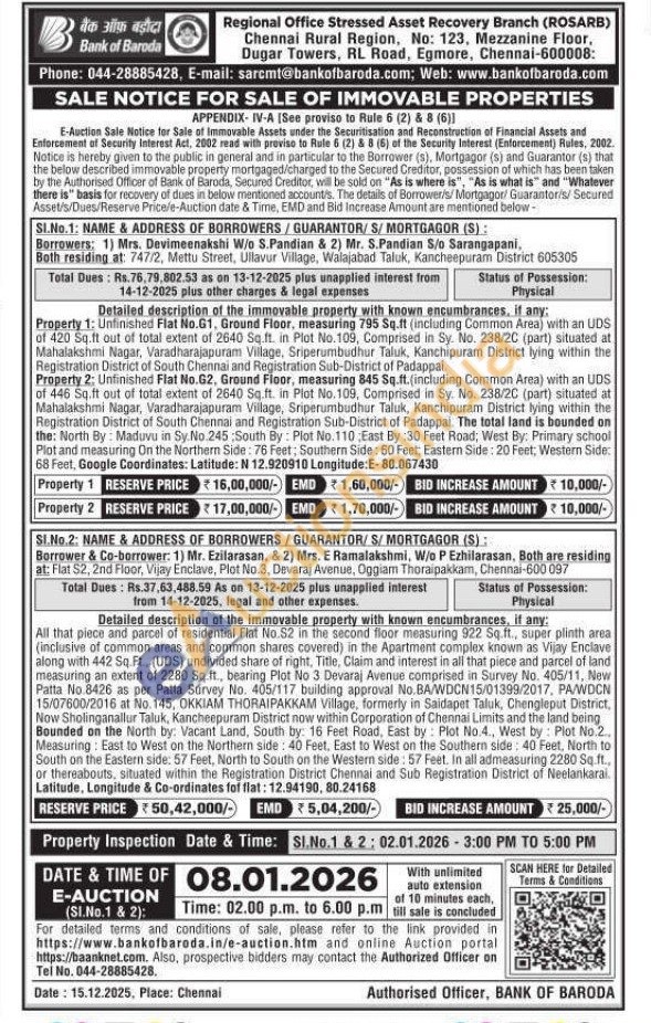 Property 1: Unfinished Flat No.G1, Ground Floor, measuring 795 Sq.ft (including Common Area) with an UDS of 420 Sq.ft out of total extent of 2640 Sq.ft. in Plot No.109, Comprised in Sy. No. 238/20 (part) situated at Mahalakshmi Nagar, Varadharajapuram Village, Sriperumbudhur Taluk, Kanchipuram District lying within the Registration District of South Chennai and Registration Sub-District of Padappai.