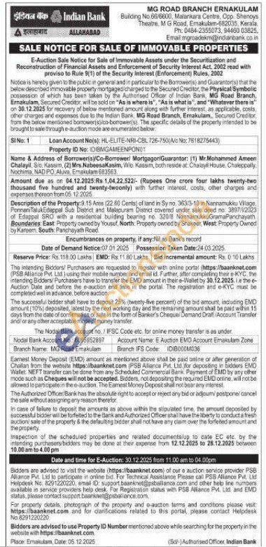 Description of the Property 9. 15 Ares (22.60 Cents of land in Syno, 3633-10 in Nannamukku Vilage. Ponnani Taluk Edappal Sub District and Malapuram District covered under sale deed no 3897/2023 of Edappal SRO with a residental buiding bearing no. 32018 NannamukkuGrama Panchayath Boundaries East Property owned by Yousuf, North Property owned by Shaker, West Property Owned by Kareem South: Panchayath Road