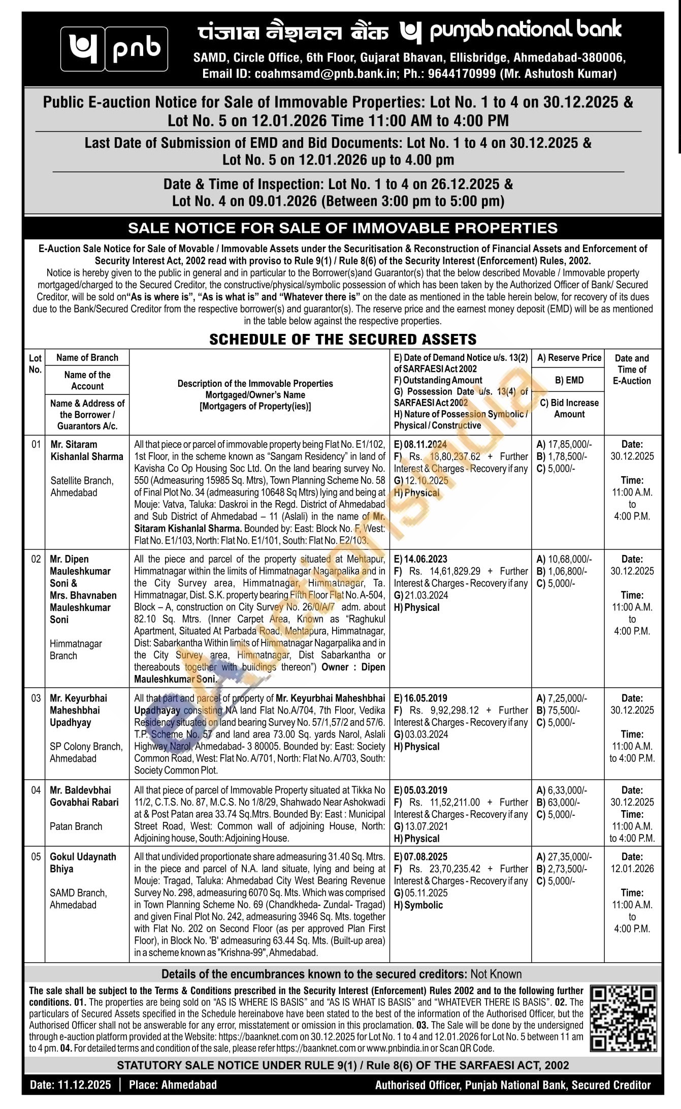All the piece and parcel of the property situated at Mehtapur, Himmatnagar within the limits of Himmatnagar Nagarpalika and in the City Survey area, Himmatnagar, Himmatnagar, Ta. Himmatnagar, Dist. S.K, property bearing Fifth Floor Flat No. A-504, Block-A, construction on City Survey No. 26/0/A/7 adm about 82.10 So Mirs (Inner Carpet Area, Known as "Raghukul Apartment, Situated At Parbada Road, Mehtapura, Himmatnagar, Dist. Sabarkantha Within limits of Himmatnagar Nagarpalika and in the City Survey area, Himmatnagar, Dist Sabarkantha or thereabouts together with buildings therean") Owner: Dipen Mauleshkumar Soni.