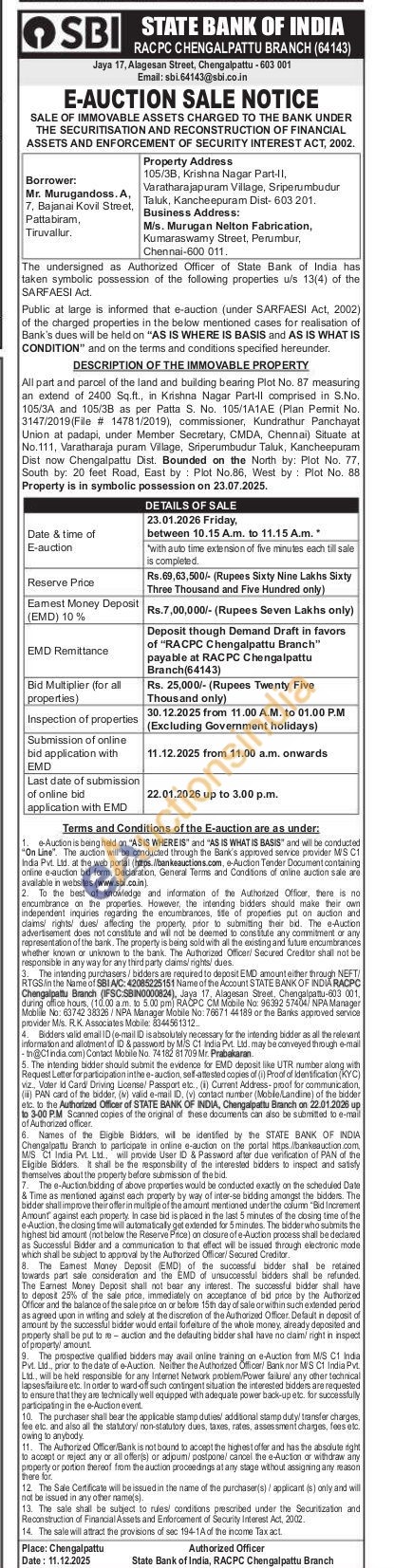 All part and parcel of the land and building bearing Plot No. 87 measuring an extend of 2400 Sq.ft., in Krishna Nagar Part-Il comprised in S.No. 105/3A and 105/3B as per Patta S. No. 105/1A1AE (Plan Permit No. 3147/2019(File # 14781/2019), commissioner, Kundrathur Panchayat Union at padapi, under Member Secretary, CMDA, Chennai) Situate at No.111, Varatharaja puram Village, Sriperumbudur Taluk, Kancheepuram Dist now Chengalpattu Dist. Bounded on the North by: Plot No. 77, South by: 20 feet Road, East by Plot No.86, West by Plot No. 88