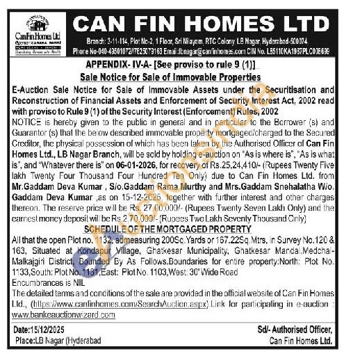 All that the open Plot no. 1132, admeasuring 200Sc. Yards or 167.22Sq. Mtrs, in Survey No. 120 & 163, Situated at Kondapur Village, Ghatkesar Municipality, Ghatkesar Mandal Medcha-Malkajgiri District, Bounded By As Follows.Boundaries for entire property: North: Plot No. 1133, South: Plot No. 1131, East: Plot No. 1103, West: 30° Wide Road