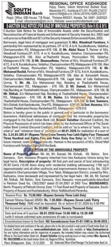 All that part and parcel of land admeasuring 26.90 Cents (10.89 Ares) along with residential building admeasuring 1700 sq.ft (approximately) and all other usufructs and improvements thereon in Sy. No. 182/4 situated in Cheriyamundam Village, Tirur Taluk, Malappuram District, owned by Mrs. Kadiyamu, (now deceased) and represented by her legal heirs: Mr. Ali, Mr. Samad Mr. Shihab, Mr. Rahim, Smt. Sameera, Smt. Haseena more particularly described in Partition Deed No. 1363/2007 dated 07.04.2007 of SRO Titur. BOUNDARIES: North: Property of Pathutti Umma, East: 11 Feet Road and Property of Sainaba, South: Property of Asseez and Kunhalankutty, West: Nellikkathotti Paramba