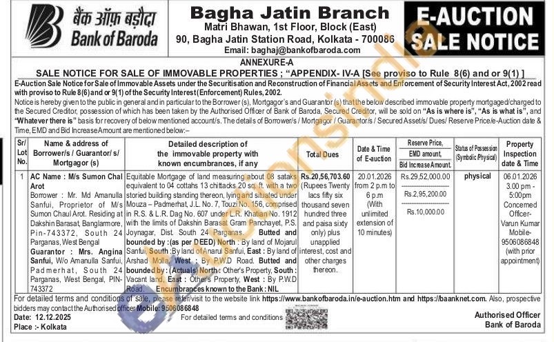 Equitable Mortgage of land measuring about 08 sataks equivalent to 04 cottahs 13 chittacks 20 sq. ft with a two storied building standing thereon, lying and situated under Mouza - Padmerhat, J.L. No. 7, Touzi No. 156, comprised in R.S. & L.R. Dag No. 607 under L.R. Khatian No. 1912 with the limits of Dakshin Barasat Gram Panchayet, P.S. Joynagar, Dist. South 24 Parganas. Butted and bounded by: (as per DEED) North: By land of Mojarul Sanful, South: By land of Anarul Sanfui, East: By land of Arshad Molla, West By P.W.D Road. Butted and bounded by: (Actuals) North: Other's Property, South: Vacant land, East: Other's Property, West: By P.W.D Road. Encumbrances known to the Bank: NIL