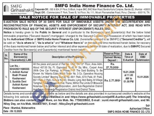 All the piece and parcel of Flat No. 1202, On 12th Floor, Area Adm. About 457.00 Sq. Ft. Equivalent To 42.47 Sq. Mtrs., Carpet Area (With One Car Parking), In Phase-1 Of The Said Building To Be Known As "Atlanta Eden World Tower No. 3 Co. Operative Housing Society Limited" Bearing Survey No. 69/1 Paiki, 67/4 Paiki, 81 Paiki, 80/1 Paiki, 2 Paiki, Survey No. 83, Situate, Lying And Being At Village Temghar, Taluka Bhiwandi, Dist. Thane, Within The Limits Of Bhiwandi Nizampur City Municipal Corporation, Joint Sub-Registration District And Taluka Bhiwandi, Registration District And District Thane.