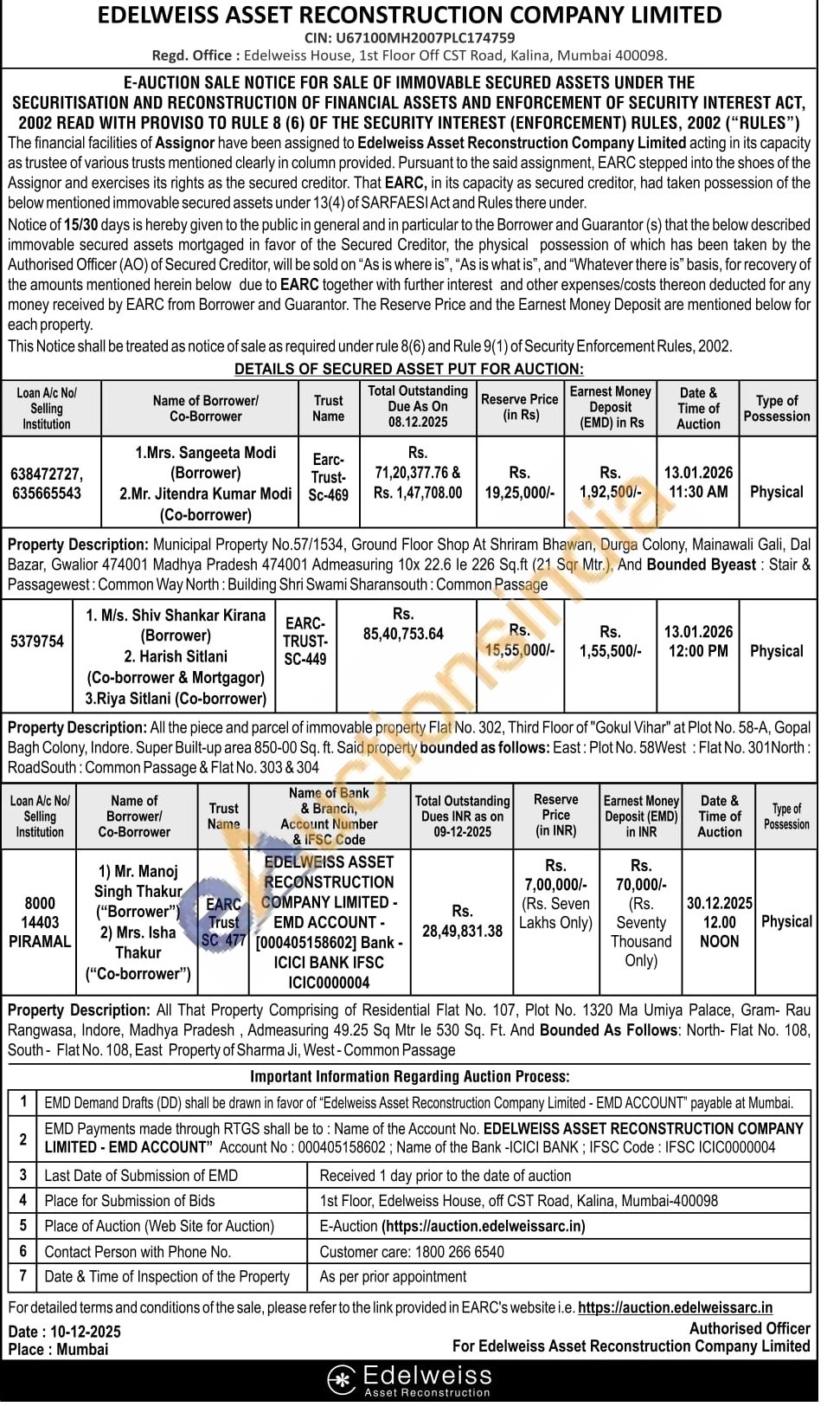 Property Description: Municipal Property No.57/1534, Ground Floor Shop At Shriram Bhawan, Durga Colony, Mainawali Gali, Dal Bazar, Gwalior 474001 Madhya Pradesh 474001 Admeasuring 10x 22.6 le 226 Sq.ft (21 Sqr Mtr.), And Bounded Byeast: Stair & Passagewest: Common Way North: Building Shri Swami Sharansouth: Common Passage