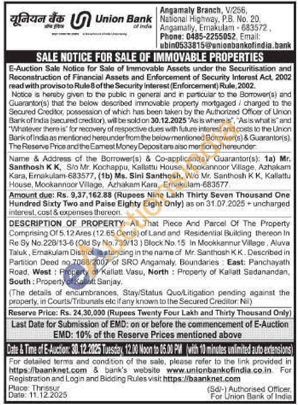Comprising Of 5.12 Ares (12.65 Cents) of Land and Residential Building thereon In Re Sy No.228/13-6 (Old Sy No.739/13) Block No. 15 In Mookkannur Village, Aluva Taluk, Emakulam District is standing in the name of Mr. Santhosh KK. Described in Partition Deed no.7088/2007 of SRO Angamaly, Boundaries: East: Panchayath Road, West: Property of Kallatt Vasu, North Property of Kallatt Sadanandan, South: Property of Kallatt Sanjay