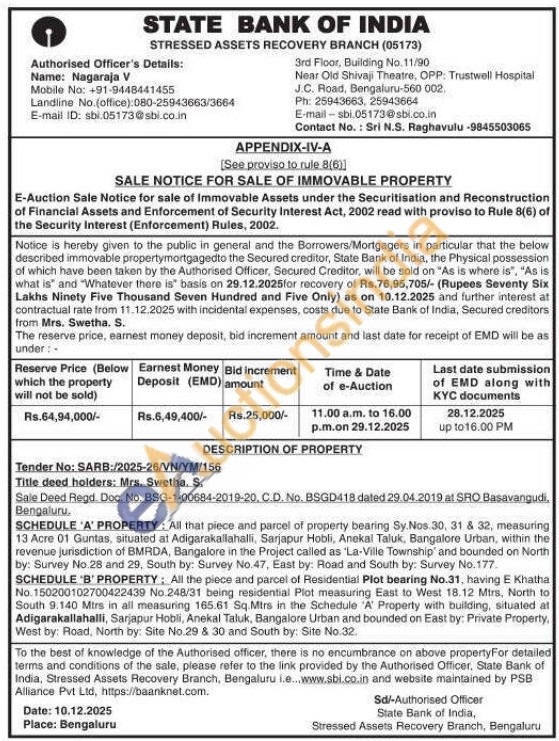 SCHEDULE 'B' PROPERTY: All the piece and parcel of Residential Plot bearing No.31, having E Khatha No. 150200102700422439 No.248/31 being residential Plot measuring East to West 18.12 Mtrs, North to South 9,140 Mirs in all measuring 165.61 Sq. Mtrs in the Schedule 'A' Property with building, situated at Adigarakallahalli, Sarjapur Hobli, Anekal Taluk, Bangalore Urban and bounded on East by: Private Property. West by: Road, North by: Site No.29 & 30 and South by: Site No.32