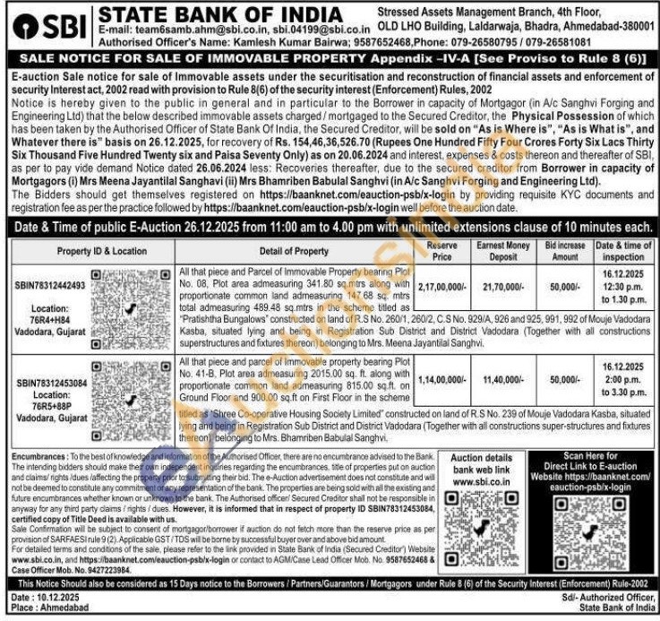 All that piece and Parcel of Immovable Property bearing Plot No. 08, Plot area admeasuring 341.80 sq.mtrs along with proportionate common land admeasuring 147.68 sq. mtrs total admeasuring 489.48 sq.mtrs in the scheme titled as "Pratishtha Bungalows" constructed on land of R.S No. 260/1, 260/2, C.S No. 929/A, 926 and 925, 991, 992 of Mouje Vadodara Kasba, situated lying and being in Registration Sub District and District Vadodara (Together with all constructions superstructures and fixtures thereon) belonging to Mrs. Meena Jayantilal Sanghvi