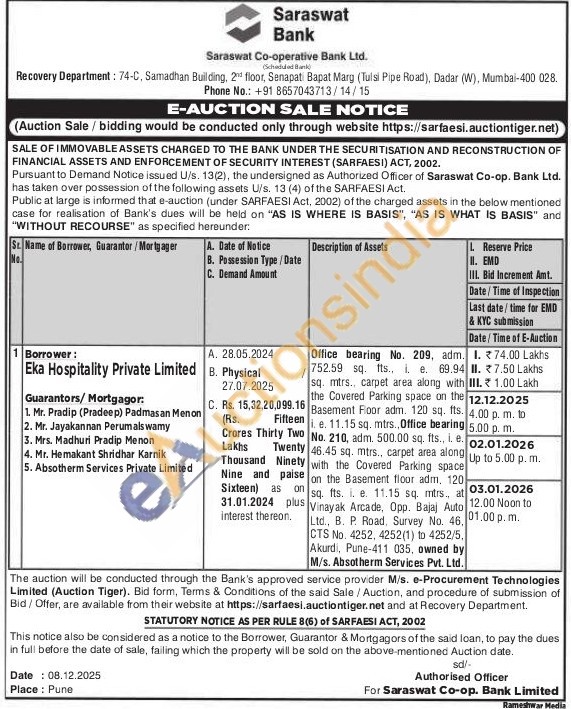 Office bearing No. 209 adm. 69.94 Office bearing No. 209, 752.59 sq. fts., i, e. sq. mtrs., carpet area along with the Covered Parking space on the Basement Floor adm. 120 sq. fts. e. 11.15 sq. mtrs., Office bearing No. 210, adm. 500.00 sq. fts., i. e. 46.45 sq. mtrs., carpet area along with the Covered Parking space on the Basement floor adm, 120 sq. fts. i. e. 11.15 sq. mtrs., at Vinayak Arcade, Opp. Bajaj Auto Ltd., B. P. Road, Survey No. 46, CTS No. 4252, 4252(1) to 4252/5, Akurdi, Pune-411 035, owned by M/s. Absotherm Services Pvt. Ltd.