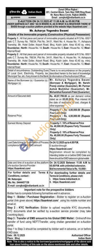 Property 2: All that piece and parcel of immovable property situated at RS No. 600/1 paiki C.T. Survey No. 766/34, Plot No. 34-51, Ward No. 4, House No. 14, Ashapura Township, Bh. Hotel Dollier, Airport Road, Bhuj, Kutch (adm. Area 43.40 sq. mtrs). Boundaries: North: House No. 19, South: House No. 11, East: House No. 13, West: Internal Road