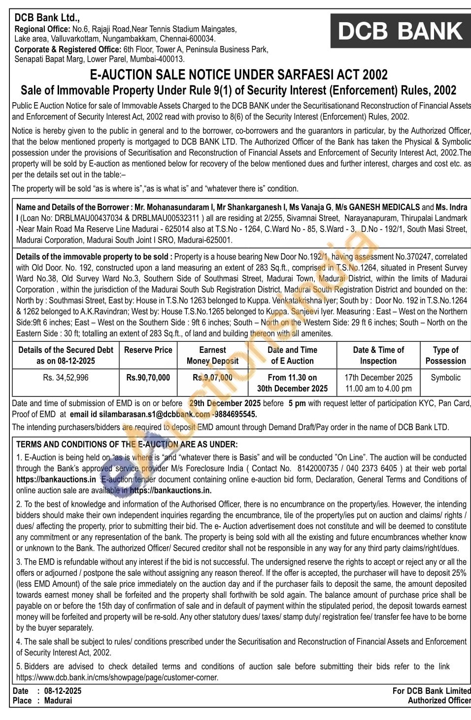 Details of the immovable property to be sold: Property is a house bearing New Door No. 192/1, having assessment No.370247, correlated with Old Door. No. 192, constructed upon a land measuring an extent of 283 Sq.ft., comprised in T.S.No. 1264, situated in Present Survey Ward No.38, Old Survey Ward No.3, Southern Side of Southmasi Street, Madurai Town, Madurai District, within the limits of Madurai Corporation, within the jurisdiction of the Madurai South Sub Registration District, Madurai South Registration District and bounded on the: North by: Southmasi Street, East by: House in T.S.No 1263 belonged to Kuppa. Venkatakrishna lyer; South by: Door No. 192 in T.S.No. 1264 & 1262 belonged to A.K.Ravindran; West by: House T.S.No. 1265 belonged to Kuppa. Sanjeevi lyer. Measuring: East-West on the Northern Side:9ft 6 inches: East-West on the Southern Side: 9ft 6 inches; South - North on the Western Side: 29 ft 6 inches: South - North on the Eastern Side: 30 ft; totalling an extent of 283 Sq.ft., of land and building thereon with all amenites.