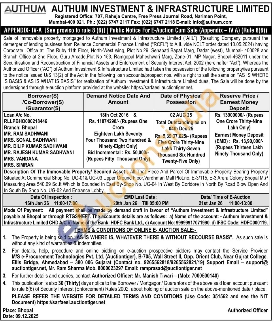 Description Of The Immovable Property/ Secured Asset: All That Piece And Parcel Of Immovable Property Bearing Property Situated At Commercial Shop No. UG-01& UG-03 Upper Ground Floor, Vardhman Mall Plot.no. E-3/115, E-3 Arera Colony Bhopal M.P Measuring Area 540.69 Sq.ft Which Is Bounded In East By-Shop No. UG-04 In West By Coridore In North By Road Blow Open And In South By Shop No. UG-02 And Entrance Lobby.